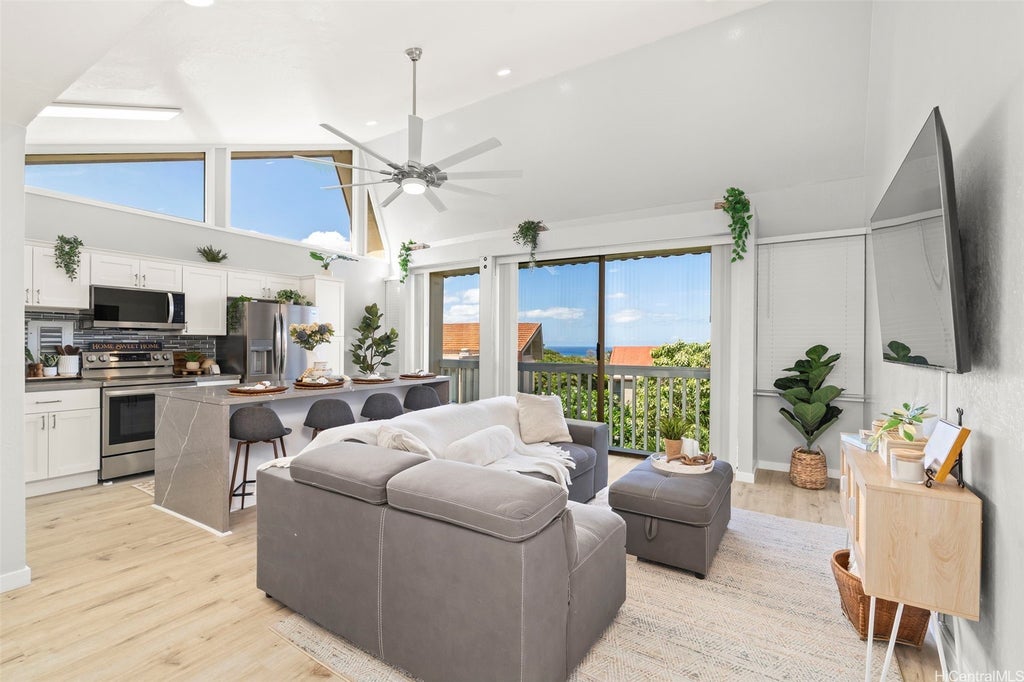 Discover this beautifully updated 2-bedroom, 1-bathroom home - perfect as a starter residence or investment opportunity. Ideally located at the base of the mountains with serene ocean views, this unit offers the best of island living. The home features a modern kitchen with elegant shaker soft-close cabinets, quartz countertops, and a waterfall-style island with ample seating. Enjoy soaring high ceilings accented by a statement ceiling fan, and a light-filled living room with luxury vinyl plank flooring throughout. The stylish bathroom includes an LED mirror and contemporary finishes. Relax on either of the two lanais and take in the stunning views of the surrounding mountain range and ocean? Located just minutes from Makaha Beach, hiking trails, and local amenities, this home offers both tranquility and convenience. Don't miss your chance to own a slice of paradise — schedule a showing today!