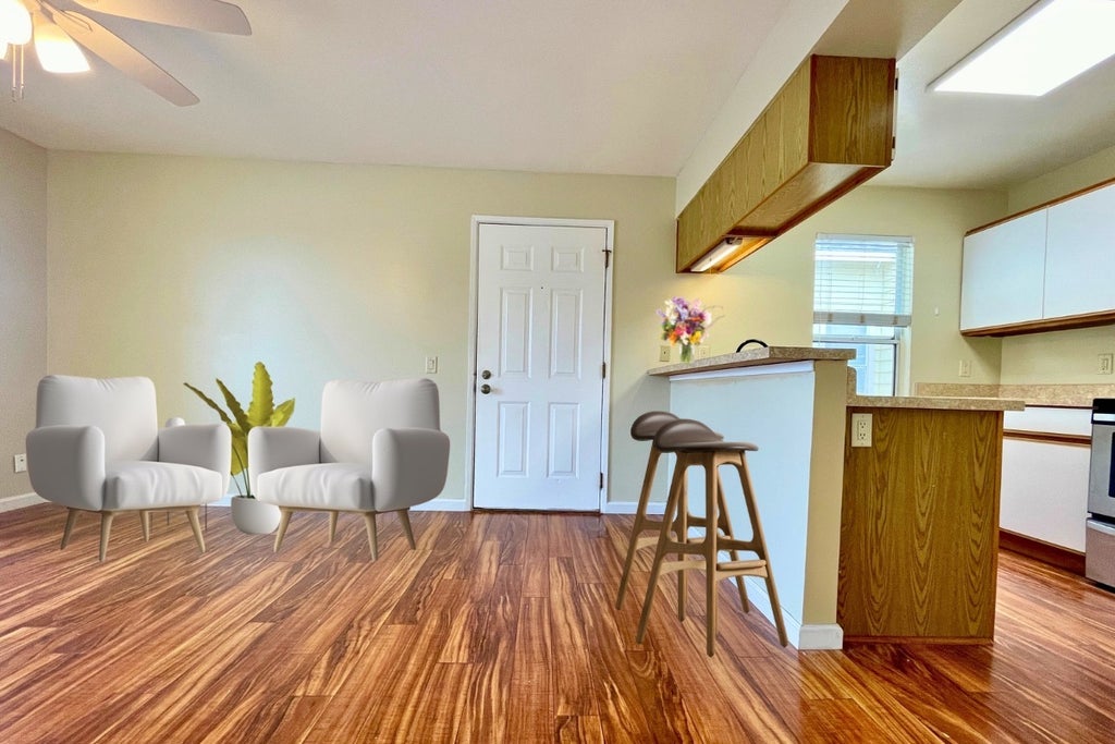 The spacious living area features fresh paint, warm wood-look laminate flooring, and a lighted ceiling fan. Open the sliding glass door to enjoy the breeze or relax on your private lanai with a locking owner’s storage closet.