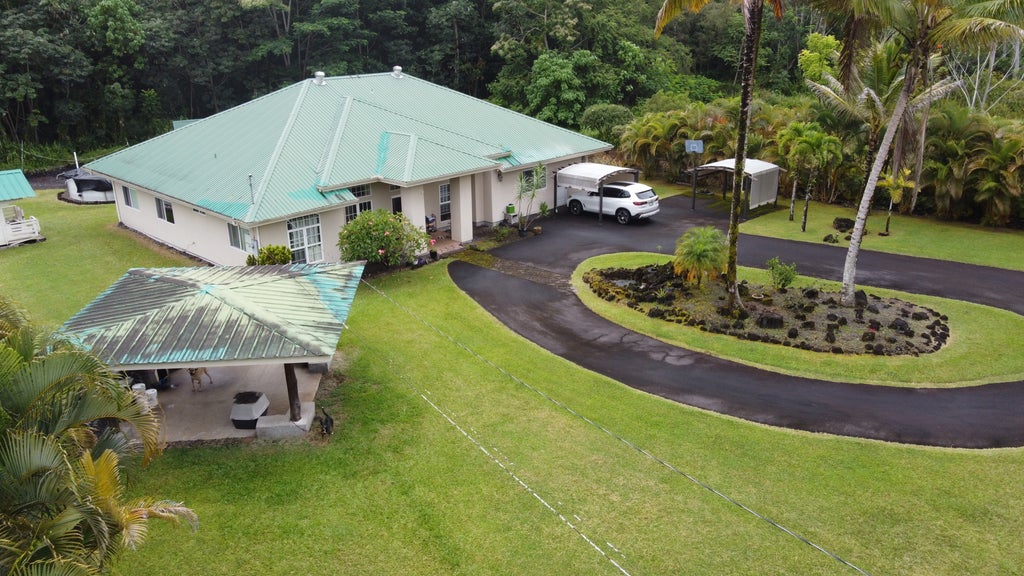 Enter this beautiful estate through automatic gate with paved driveway and beautifully landscape with palms, Puakenikeni, coconut trees, song of India, Bougainvillaea, Citrus tree, pineapple, and more. Enter into the home into a great room great for entertaining, wonderful open floor plan and extra family room with great space for family gatherings. Home has beautiful laminate flooring and tile throughout the home. The home has great sized rooms and 3 baths in the main home. Primary room has a jacuzzi tub, walk in closet and shower. This is a must see home. Come and see this great unique home in Paradise.