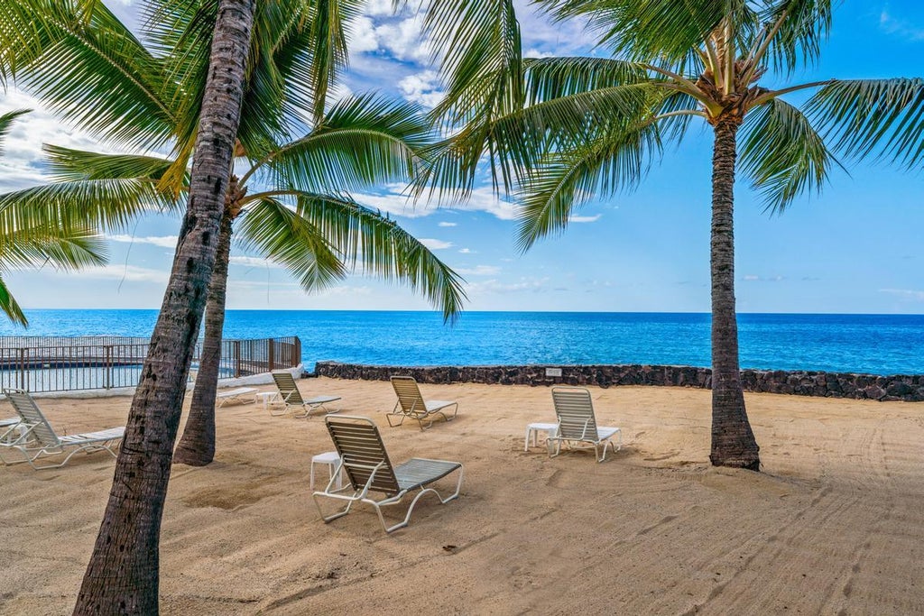 Kona beachfront Beauty! One unit back from the ocean. A level entry ground floor Deluxe sized unit. Positioned next to the beautiful saltwater oceanfront pool & oceanfront grills & dining area allowing ease to cook and dine there on the beach or on your nearby lanai with ocean view.