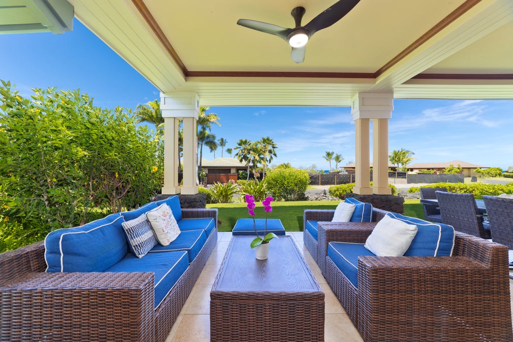 Discover the epitome of luxury resort living at Kolea, ideally located within the prestigious Waikoloa Beach Resort. Kolea is an exclusive gated community offering direct oceanfront access to the stunning Anaeho’omalu Bay. This ground-floor corner unit, Kolea 4A, provides exceptional privacy and generous living space, complimented by spacious grassy areas for your enjoyment. Featuring three bedrooms and three ensuite bathrooms, this fully furnished property also includes an interior laundry room and an attached one-car garage, ensuring convenience and ease for both residents and guests. The primary suite includes private access to its own lanai offering peaceful tranquility. Additionally, Kolea 4A includes extra storage options with closets situated in the hallway leading to the garage, as well as within the garage itself. Both of these spaces are designated as owner’s closets, providing ample room for personal storage. The seamless open floor plan offers the perfect layout for both entertaining and relaxation. The well-designed kitchen offers all the essentials a chef and guests could need. Elegant pocket doors can be closed for enhanced privacy, and motorized sun shades provide added sun protection and sophistication.