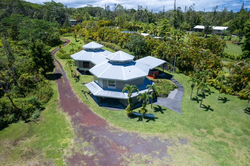 This unconventional structure also enhances airflow, allowing for more efficient ventilation. the layout works hand-in-hand with other architectural elements, such as the cupula, to ensure that the home remains well-ventilated and comfortable throughout the year, while keeping energy cost manageable. The geometric form also gives the home an inviting presence, its design standing out as a bold and beautiful statement amidst the landscaped acre of land surrounding it. Provides ample accommodations for family and guests. Each bedroom is designed to maximize privacy and comfort, the guest studio includes all necessary amenities, with access to private bathroom, and laundry room. Also included is a detached 2-car carport and enclosed room, covered lanai and outdoor bath.