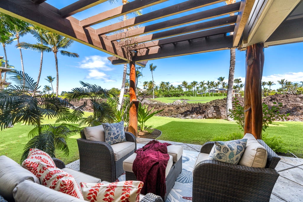 This 2 story Golf Villa with spacious lanais has panoramic views of the 10th tee and fairway of Mauna Lani Golf South course. Golf Villas F-1 is a highly desired END UNIT, and one of the best sunset facing locations at Golf Villas and plenty of area for entertaining. This Villa also has a one car garage with additional parking space in front of the garage. Directly across from the pool and exercise facilities.