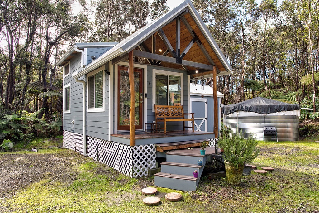 Live completely off grid in this luxury tiny home that is just a 5-minute drive from Volcanos National Park. This unique home invites immediate occupancy and is crafted with custom features all around. Home boasts full-size appliances and artisanal monkey pod and ohia accents. Whether you prefer to unwind on the front porch or escape to the queen-size loft, this home offers a serene retreat with beautiful landscaping including several lemon trees, rainbow eucalyptis and many flowering shrubs.. Relax in the luxurious full size jetted tub equipped with a rainfall showerhead, or showcase your culinary skills in the well-appointed kitchen. A 12x8 shed stores the catchment triple filtration system & houses the Outback photovoltaic equipment with 8 batteries insuring plenty of power. Plenty of water storage with a 13,000 gallon catchment tank! There is also a back up generator just in case, however Sellers have not needed to use this in the past two years of ownership. Notably, this mobile home is on wheels offering the flexibility to relocate it!