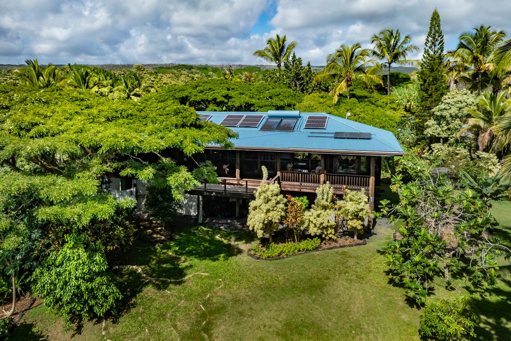 Entering the front foyer with Saltillo tile, the custom staircase brings you to the 2024 SF main living area and impressive great room with vaulted ceilings, blue eucalyptus floors, ohia posts and beams, redwood & teak, and hand-crafted doors and windows. Over-sized pocket sliding doors offer a 16 foot open-air gateway to the covered lanai for the indoor/outdoor living we cherish here in Hawaii. You’ll enjoy gorgeous sunrises, ocean views, and starry nights, living your best Hawaii life.