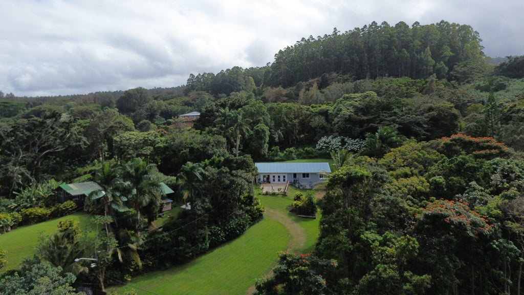 Nature lovers will appreciate the variety of mature fruit trees, including macadamia, banana, papaya, Tahitian lime, coconut, noni, wild berries, guava, and ginger, as well as tropical plants like plumeria, gardenia, aloe, monstera, and basil. A neighboring spring-fed stream and waterfall provide a soothing soundtrack, enhancing the peaceful atmosphere.