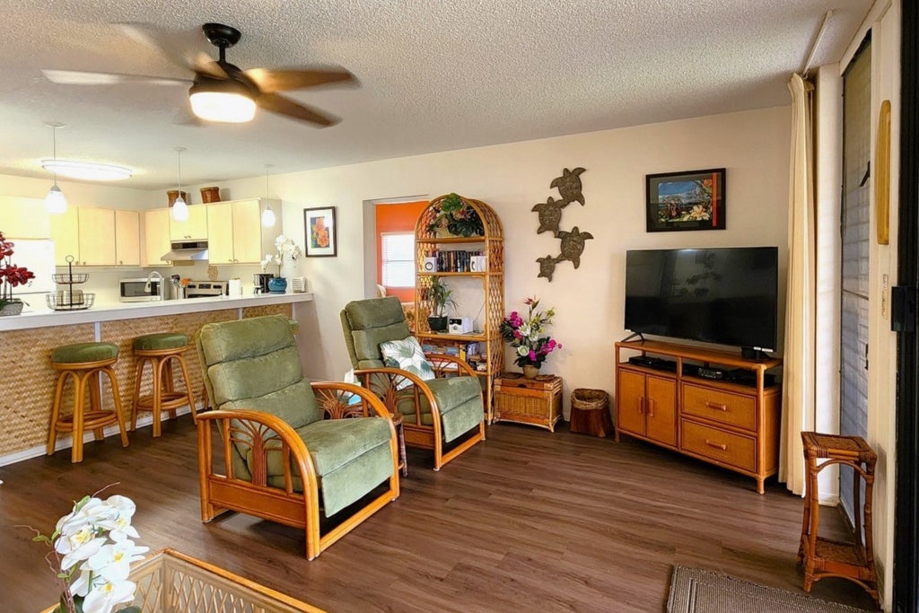 Discover serenity at this single-story ground floor condo nestled in Waikoloa Villas, offering views of the ocean and the Waikoloa Village golf course. Relax on the oversized lanai amidst lush tropical grounds, where wild turkeys roam and vibrant sunsets illuminate the sky. The lanai is the perfect spot for enjoying your morning coffee or evening cocktails. This condo is just a few steps away from one of the two inviting pools. Waikoloa Villas features two swimming pools, spas, cabanas, outdoor kitchens and BBQ areas for your enjoyment.