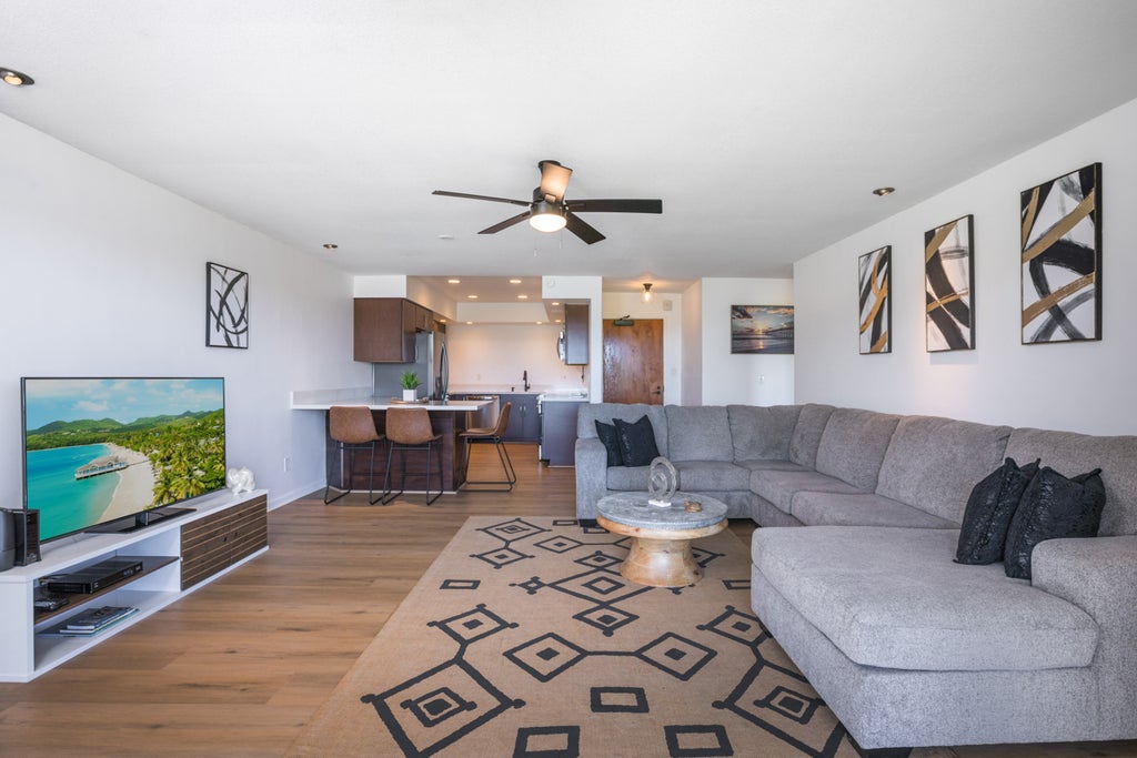 The large sliding doors and unit position affords wonderful natural light with great cross ventilation breeze. The views can be enjoyed from the lanai, living room, kitchen and primary bedroom. The large lanai extends from the living room to the primary bedroom and it’s the perfect space to enjoy the views, sunset and BBQ.