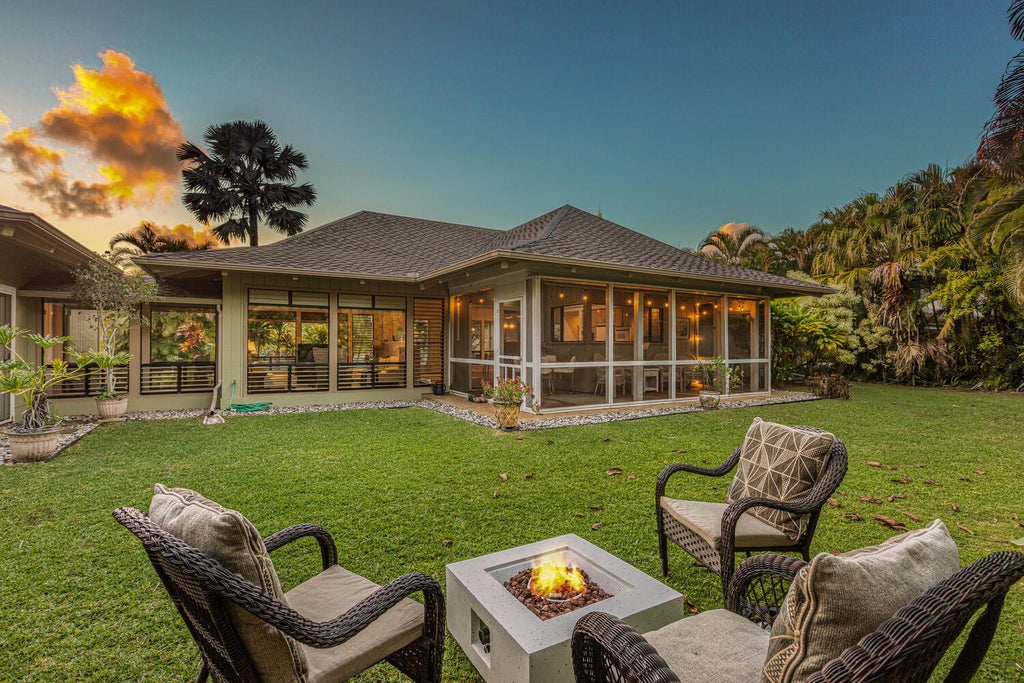This successful vacation rental is a single story, turn key, furnished 3 bedroom 2 bath with split floor plan that's move-in ready. Open beam soaring plantation ceilings, screened lanai, and an abundance of windows for trade winds and natural light. Chef style kitchen with lots of counter space. Kitchen opens to dining and living area, great for entertaining. Large master bedroom with Jacuzzi tub, separate shower and walk in closet. Separate laundry room with a full size, side by side washer-dryer. Oversized 2 car enclosed garage with a large overhead storage area. Wood and polished concrete floors. Private yard with banana and papaya trees. Home comes furnished and is also "plumbed" for a central vacuum system. Just off the living area there is a screened in lanai that is great to have breakfast or dinner while relaxing bug free! Walking distance to Princeville's park, library, and shopping center.