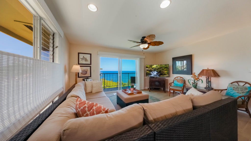 Inside, the condo is thoughtfully updated with **all-new flooring** and **modernized bathrooms**, offering a fresh and stylish ambiance. The open-concept layout ensures **ocean views from the living room and both bedrooms**, immersing you in the beauty of Kauai from every angle.
