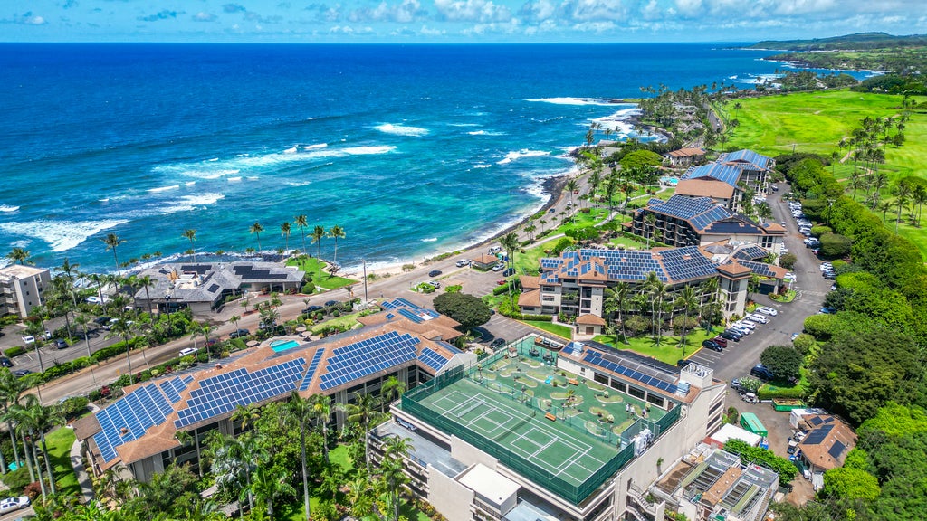 Stunning location in beautiful sunny Poipu. Across the street from Beach House Restaurant, popular surf spots and snorkeling. 1bdrm unit is fully furnished, AC, washer/dryer onsite, elevators, parking, recreation room, exercise area, BBQs, 3 pools, jacuzzies, mini golf, tennis and pickleball courts on property.