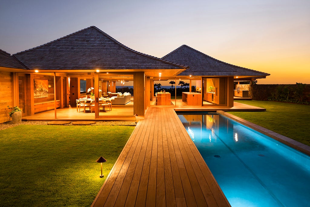 Beyond the teak and stone entry, you’ll find a 15-meter lap pool astride an ipe walkway and sun deck. Distinct pod-style roof lines appear to float above glass walls, framing ocean vistas that complement the warm teak interior.